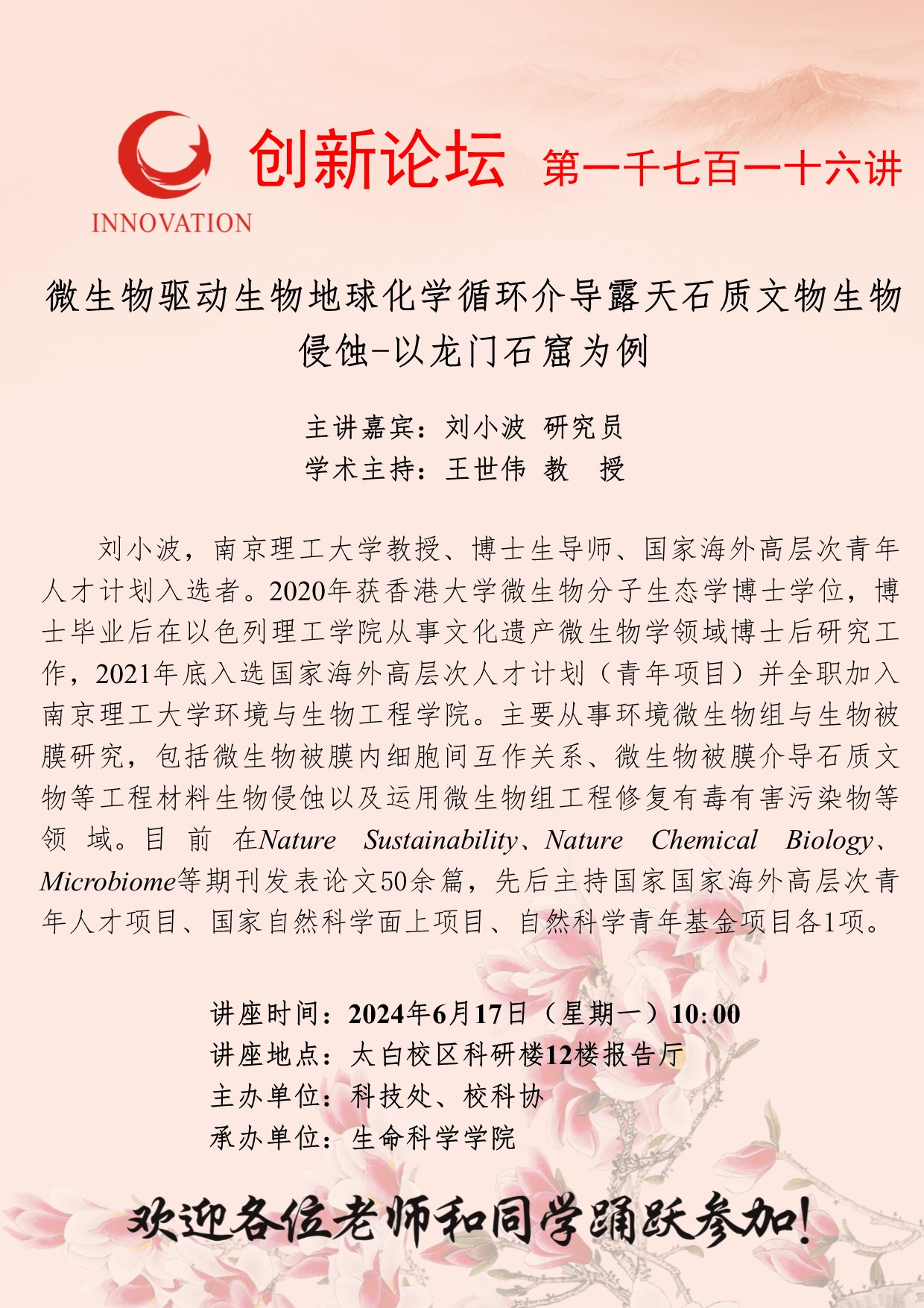刘小波 研究员 BB平台创新论坛第一千七百一十六讲:微生物驱动生物地球化学循环介导露天石质文物生物侵蚀-以龙门石窟为例 讲座时间 2024年6月17日(星期一)10:00 讲座地点 太白校区科研楼12楼报告厅 讲座人介绍 刘小波 研究员 讲座内容
