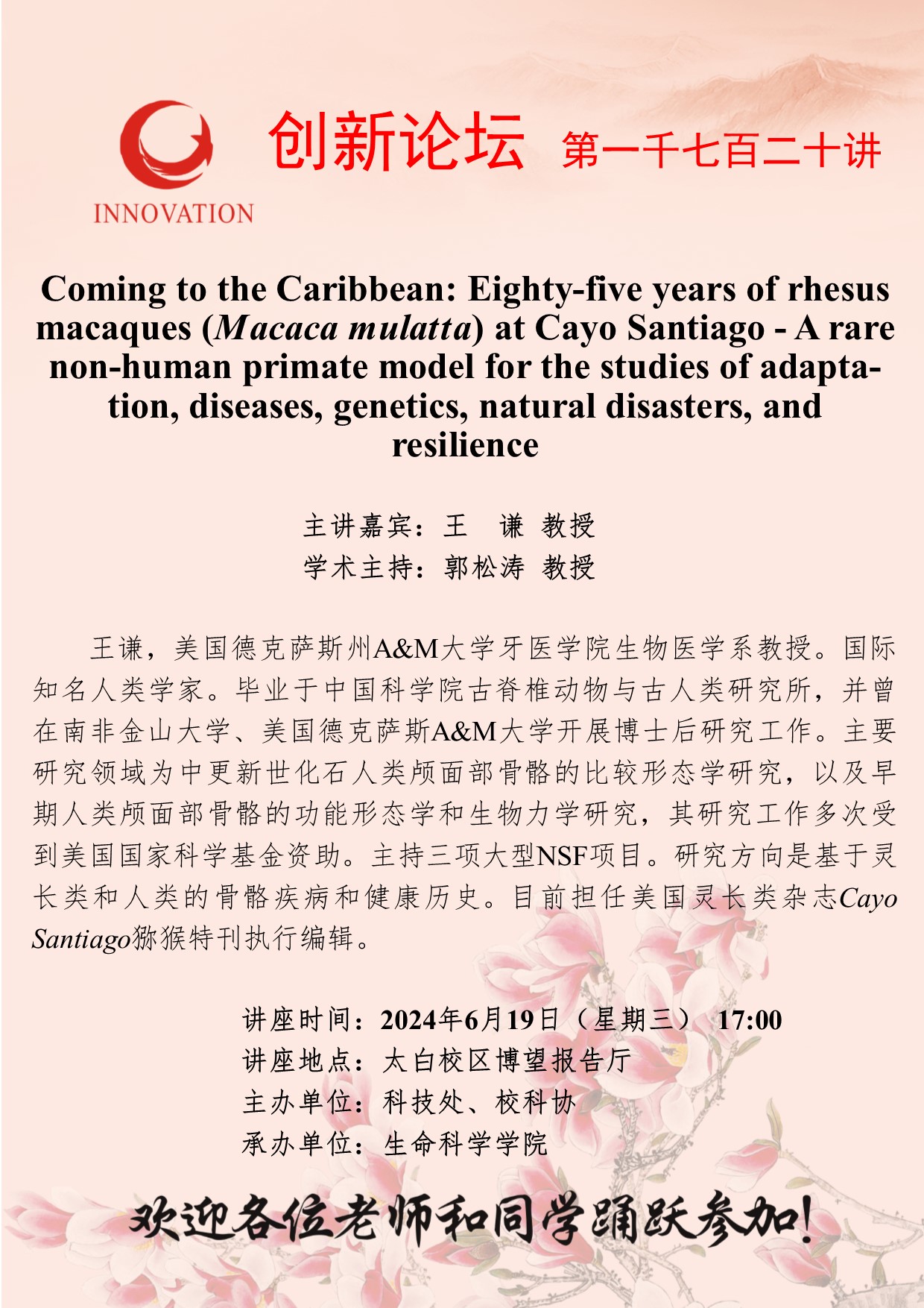 王谦 教授 BB平台创新论坛第一千七百二十讲:Coming to the Caribbean: Eighty-five years of rhesus macaques (Macaca mulatta) at Cayo Santiago - A rare non-human primate model for the studies of adaptation, diseases, genetics, natural disasters, and resilience 讲座时间 2024年6月19日(星期三) 17:00 讲座地点 太白校区博望报告厅 讲座人介绍 王谦 教授 讲座内容