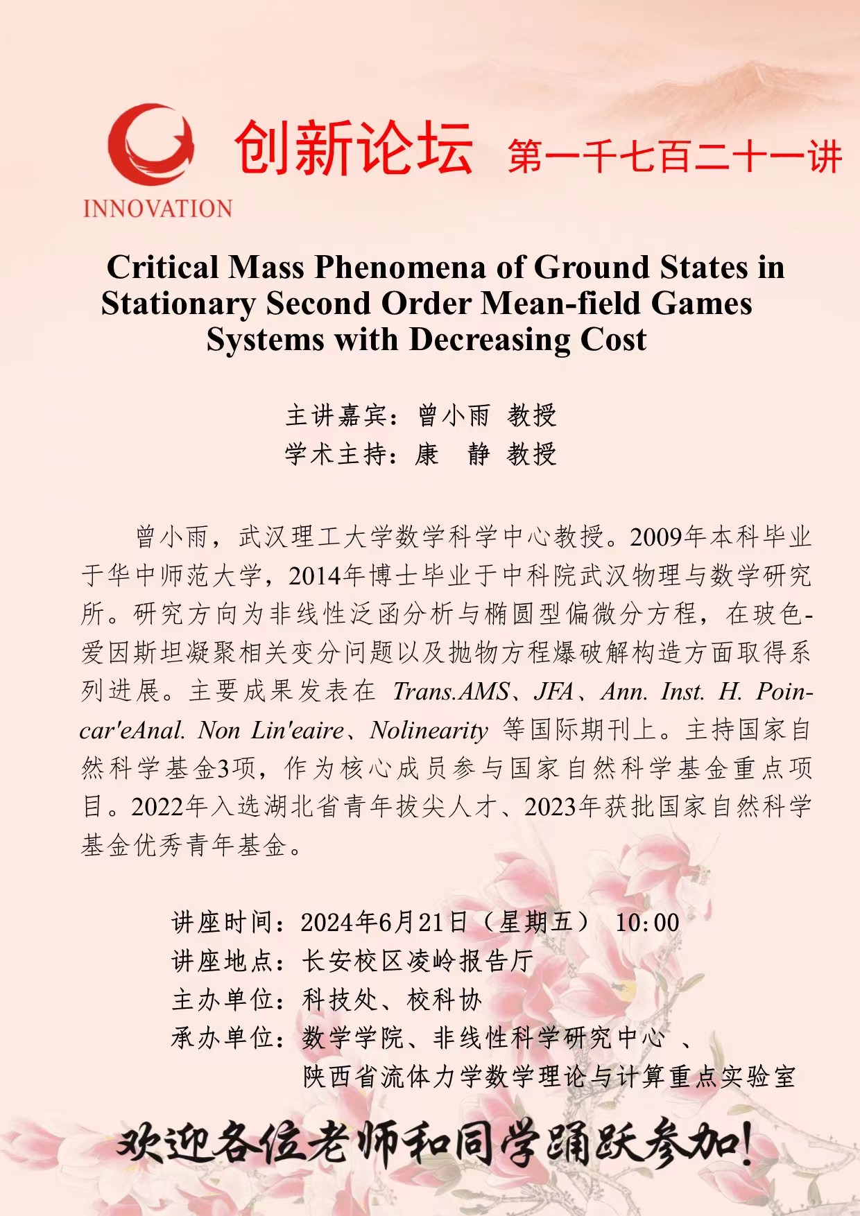 曾小雨 教授 BB平台创新论坛第一千七百二十一讲: Critical Mass Phenomena of Ground States in Stationary Second Order Mean-field Games Systems with Decreasing Cost 讲座时间 2024年6月21日(星期五) 10:00 讲座地点 长安校区凌岭报告厅 讲座人介绍 曾小雨 教授 讲座内容