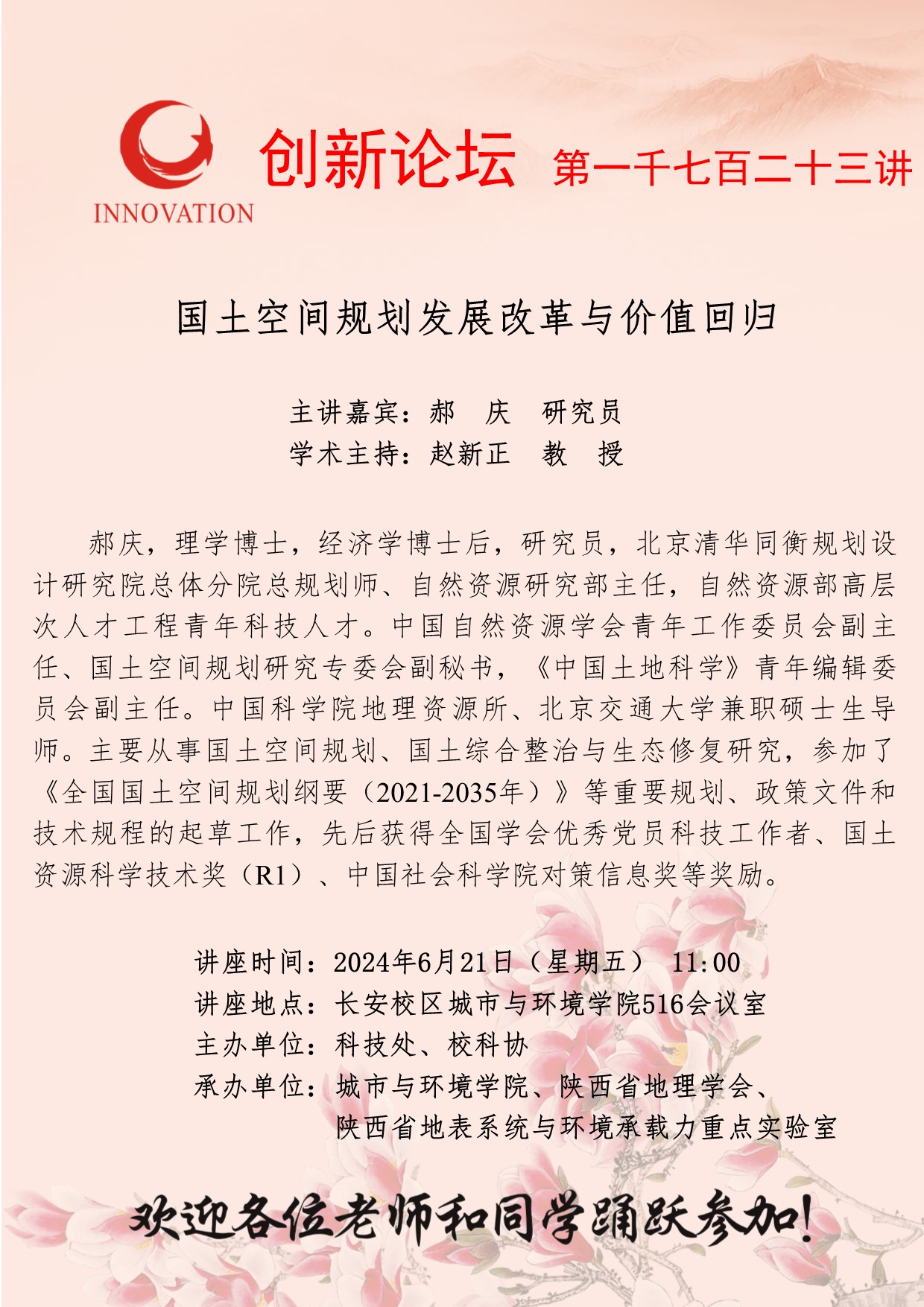 郝庆 研究员 BB平台创新论坛第一千七百二十三讲:国土空间规划发展改革与价值回归 讲座时间 2024年6月21日(星期五) 11:00 讲座地点 长安校区城市与环境学院516会议室 讲座人介绍 郝庆 研究员 讲座内容