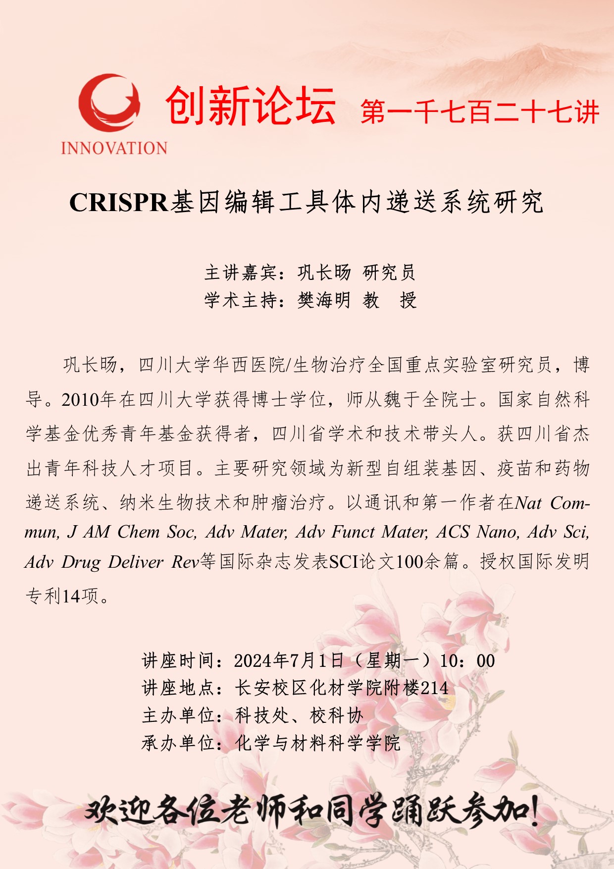 巩长旸 研究员 BB平台创新论坛第一千七百二十七讲:CRISPR基因编辑工具体内递送系统研究 讲座时间 2024年7月1日(星期一)10:00 讲座地点 长安校区化材学院附楼214 讲座人介绍 巩长旸 研究员 讲座内容