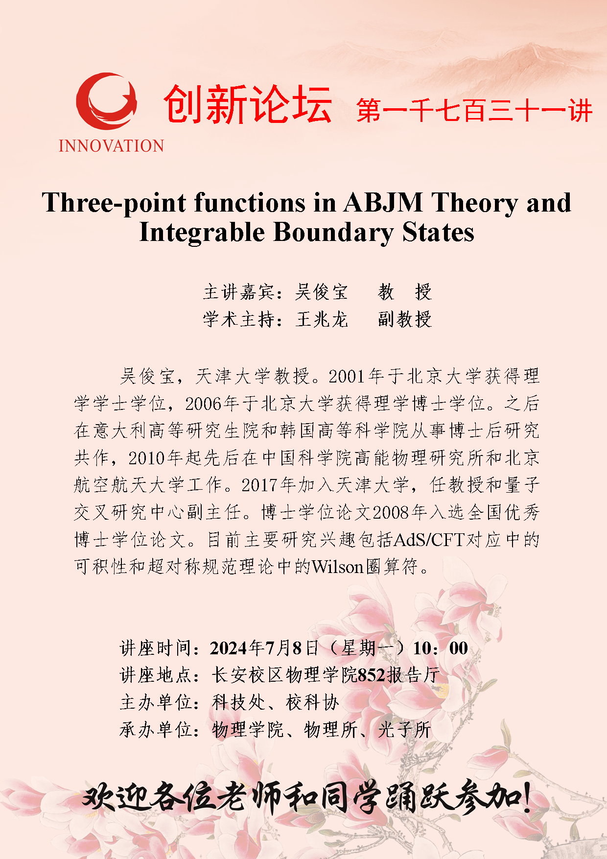 吴俊宝 教授 BB平台创新论坛第一千七百三十一讲:Three-point functions in ABJM Theory and Integrable Boundary States 讲座时间 2024年7月8日(星期一)10:00 讲座地点 长安校区物理学院852报告厅 讲座人介绍 吴俊宝 教授 讲座内容