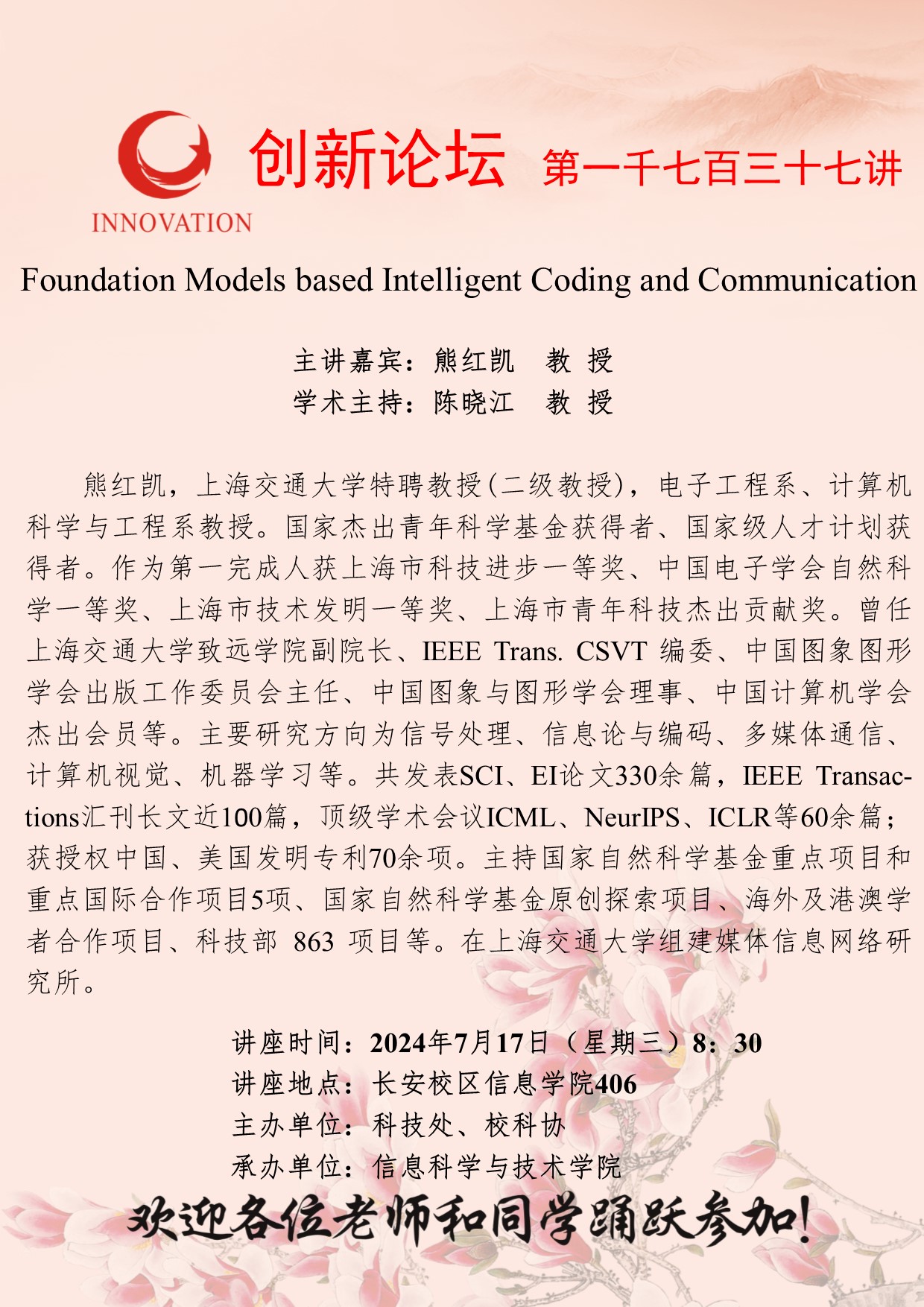 熊红凯 教授 BB平台创新论坛第一千七百三十七讲:Foundation Models based Intelligent Coding and Communication 讲座时间 2024年7月17日(星期三)8:30 讲座地点 长安校区信息学院406 讲座人介绍 熊红凯 教授 讲座内容