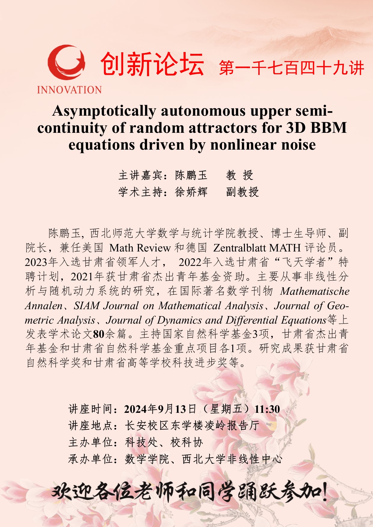 陈鹏玉 教授 BB平台创新论坛第一千七百四十九讲:Asymptotically autonomous upper semi-continuity of random attractors for 3D BBM equations driven by nonlinear noise 讲座时间 2024年9月13日(星期五)11:30 讲座地点 长安校区东学楼凌岭报告厅 讲座人介绍 陈鹏玉 教授 讲座内容