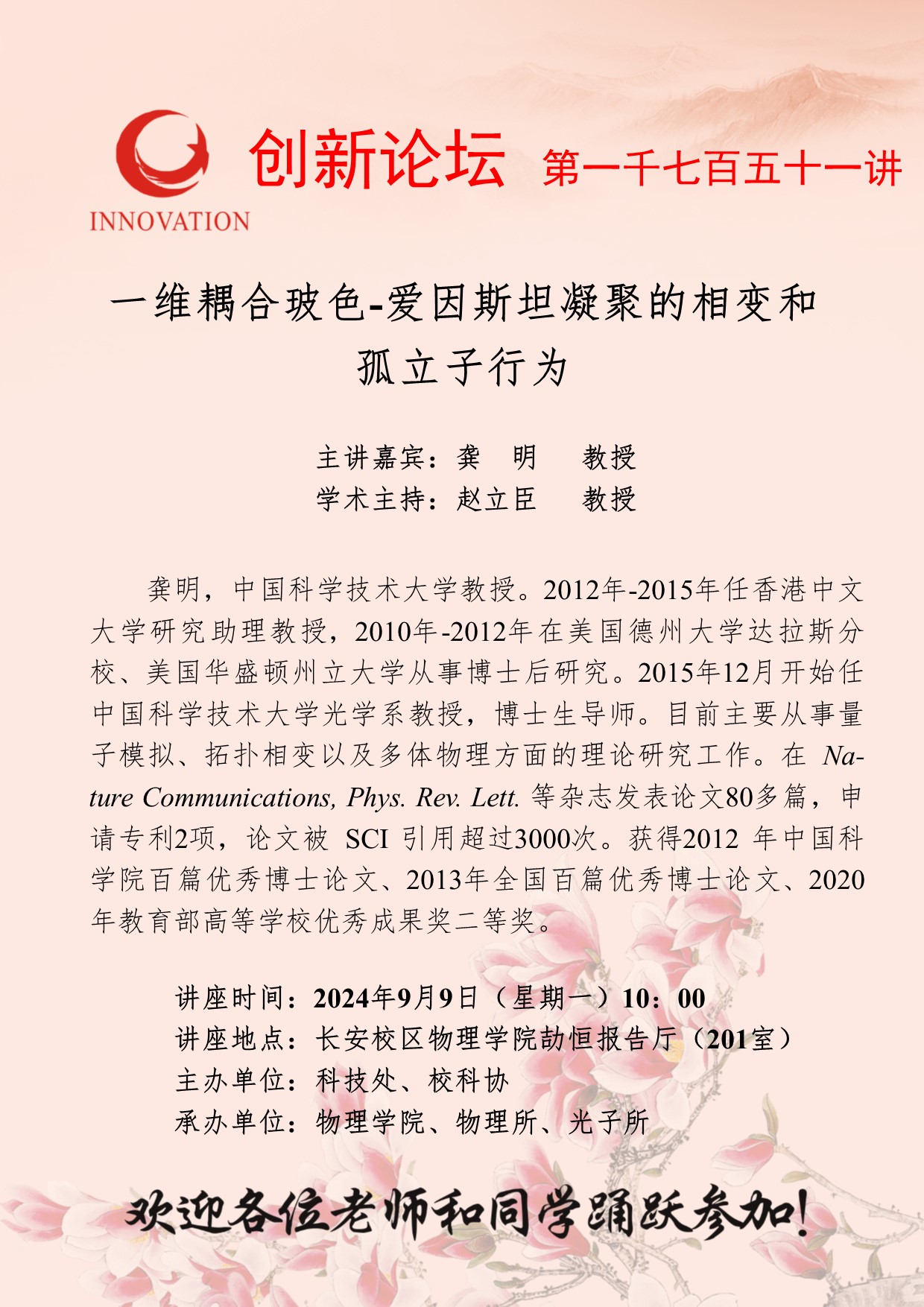 龚明 教授 BB平台创新论坛第一千七百五十一讲:一维耦合玻色-爱因斯坦凝聚的相变和孤立子行为 讲座时间 2024年9月9日(星期一)10:00 讲座地点 长安校区物理学院劼恒报告厅(201室) 讲座人介绍 龚明 教授 讲座内容