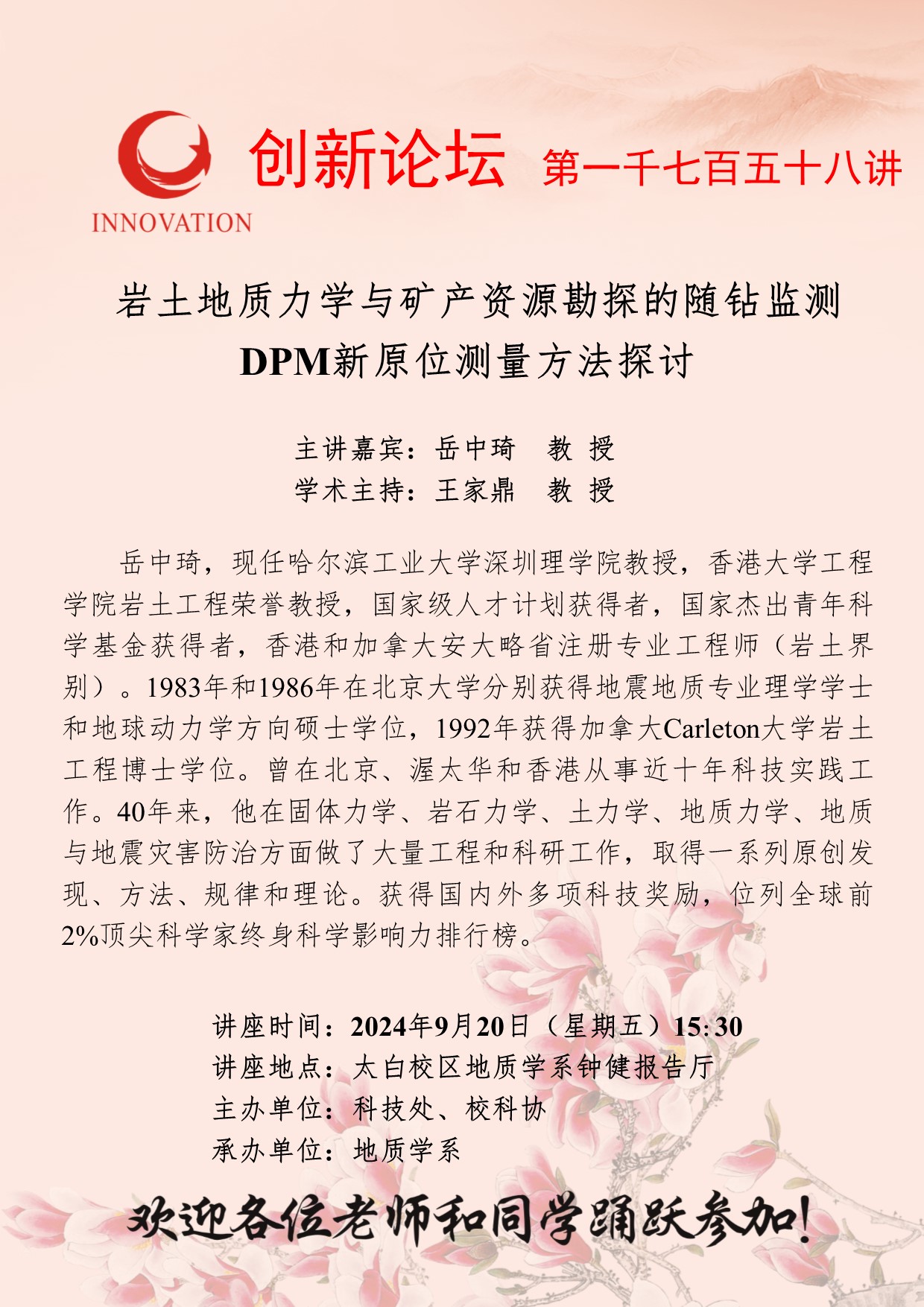 岳中琦 教授 BB平台创新论坛第一千七百五十八讲:岩土地质力学与矿产资源勘探的随钻监测 DPM新原位测量方法探讨 讲座时间 2024年9月20日(星期五) 15:30 讲座地点 太白校区地质学系钟健报告厅 讲座人介绍 岳中琦 教授 讲座内容