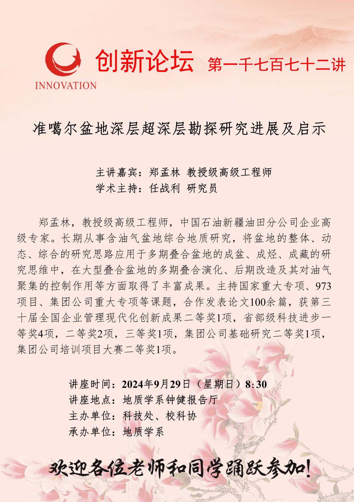 郑孟林 教授级高级工程师 BB平台创新论坛第一千七百七十二讲:准噶尔盆地深层超深层勘探研究进展及启示 讲座时间 2024年9月29日(星期日)8:30 讲座地点 地质学系钟健报告厅 讲座人介绍 郑孟林 教授级高级工程师 讲座内容