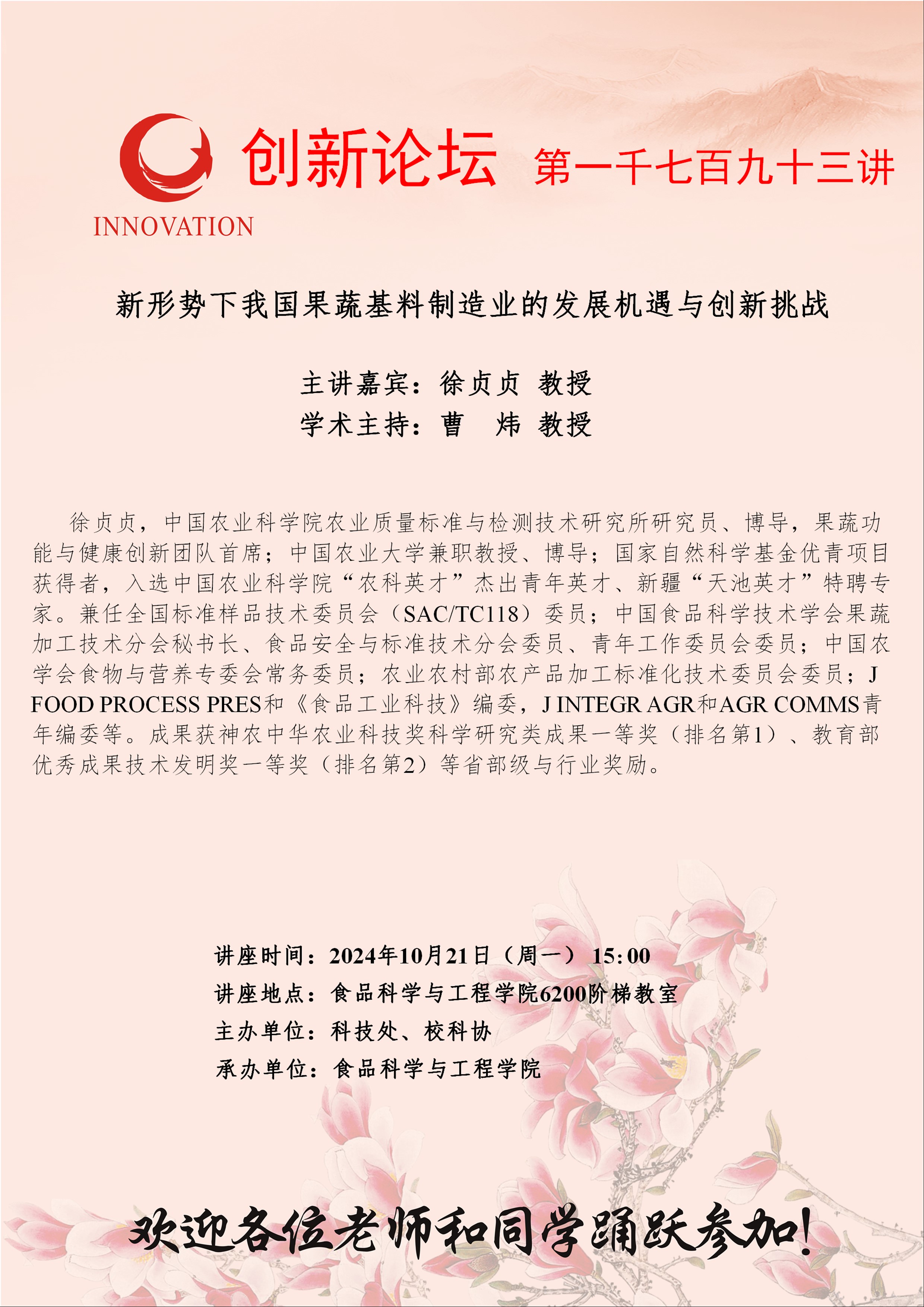 徐贞贞 教授 BB平台创新论坛第一千七百九十三讲: 新形势下我国果蔬基料制造业的发展机遇与创新挑战 讲座时间 2024年10月21日(星期一)15:00 讲座地点 太白校区食品科学与工程学院6200阶梯教室 讲座人介绍 徐贞贞 教授 讲座内容