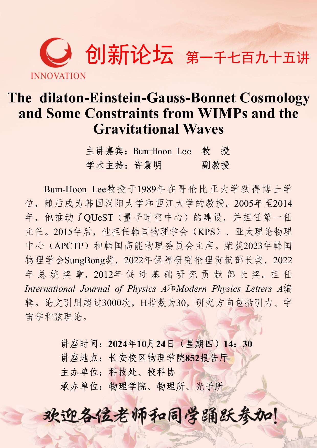 Bum-Hoon Lee 教授 BB平台创新论坛第一千七百九十五讲:The dilaton-Einstein-Gauss-Bonnet Cosmology and Some Constraints from WIMPs and the Gravitational Waves 讲座时间 2024年10月24日(星期四)14:30 讲座地点 长安校区物理学院852报告厅 讲座人介绍 Bum-Hoon Lee 教授 讲座内容