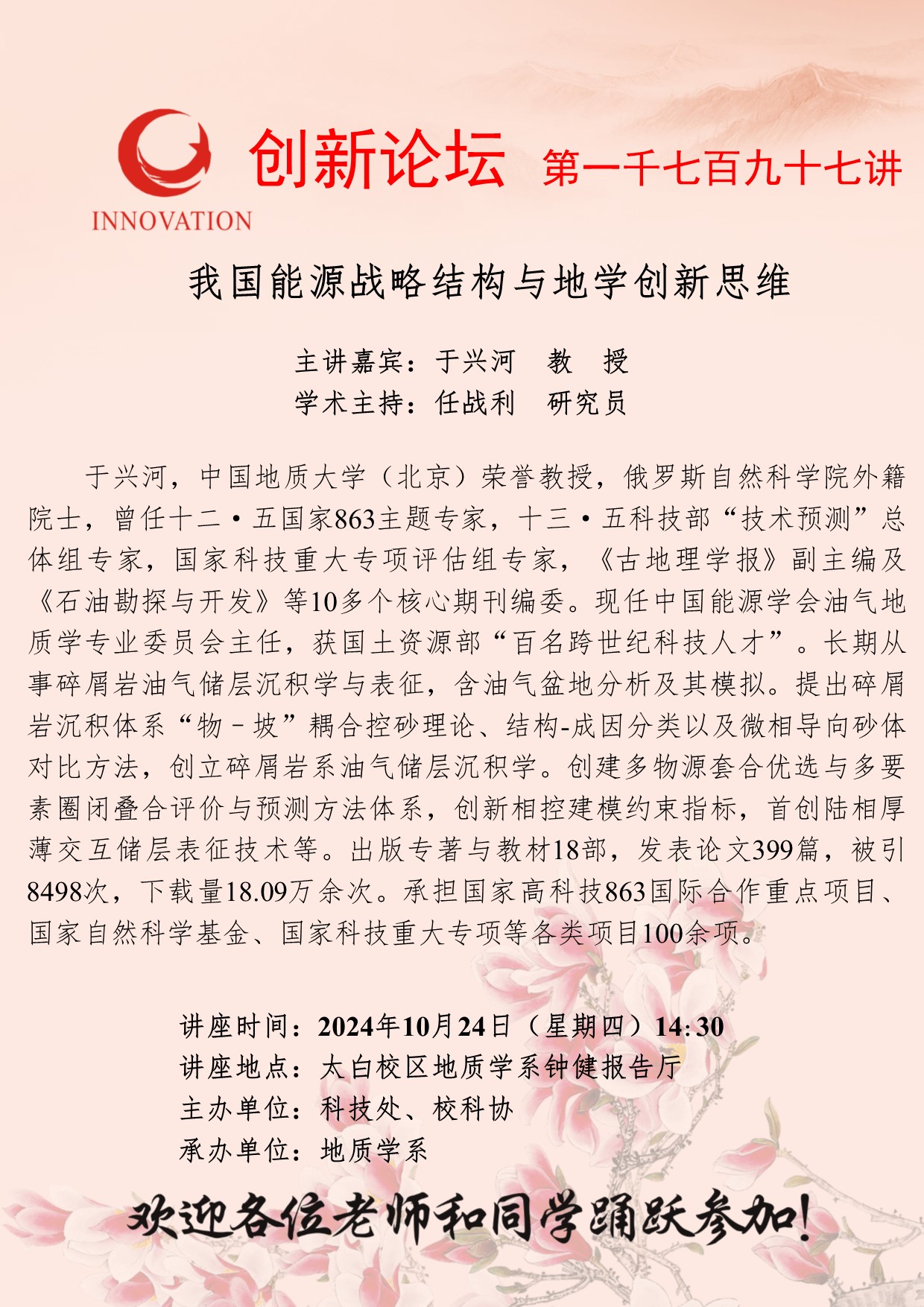 于兴河 教授 BB平台创新论坛第一千七百九十七讲:我国能源战略结构与地学创新思维 讲座时间 2024年10月24日(星期四)14:30 讲座地点 太白校区地质学系钟健报告厅 讲座人介绍 于兴河 教授 讲座内容
