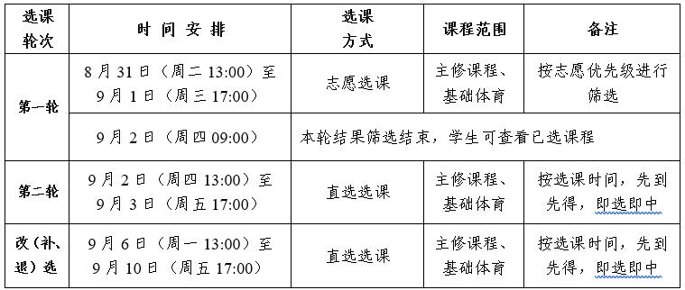 备注:每轮选课期间,所有课程均可退可选;每轮选课结束、筛选完毕后,已选中的体育课程不可退选。《军事技能训练》课程不参与选课。