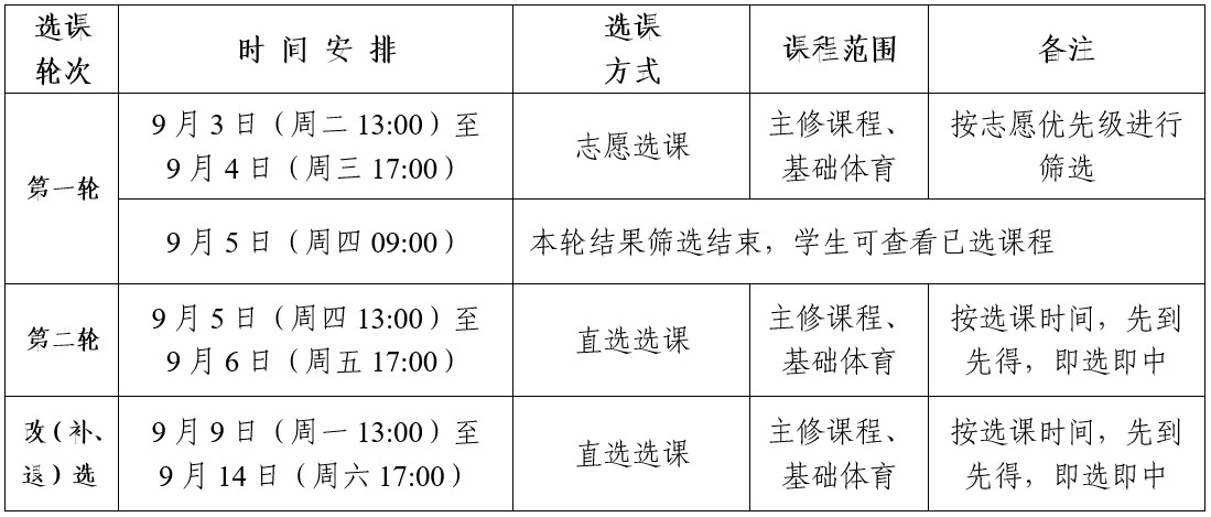 根据学校教学工作安排,2024级本科新生本学期选课定于9月3日(周二)开始。请各院(系)提前做好新生选课指导工作。为保证选课工作顺利开展,现将有关事项安排如下: