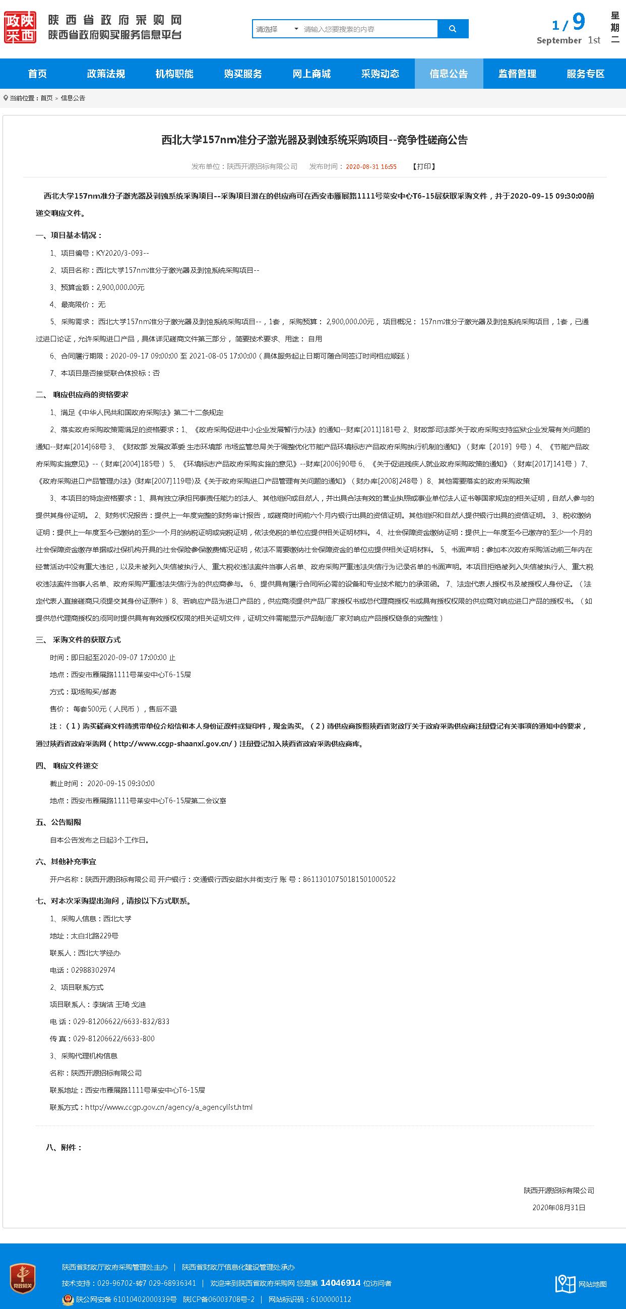 BB平台157nm准分子激光器及剥蚀系统采购项目竞争性磋商公告