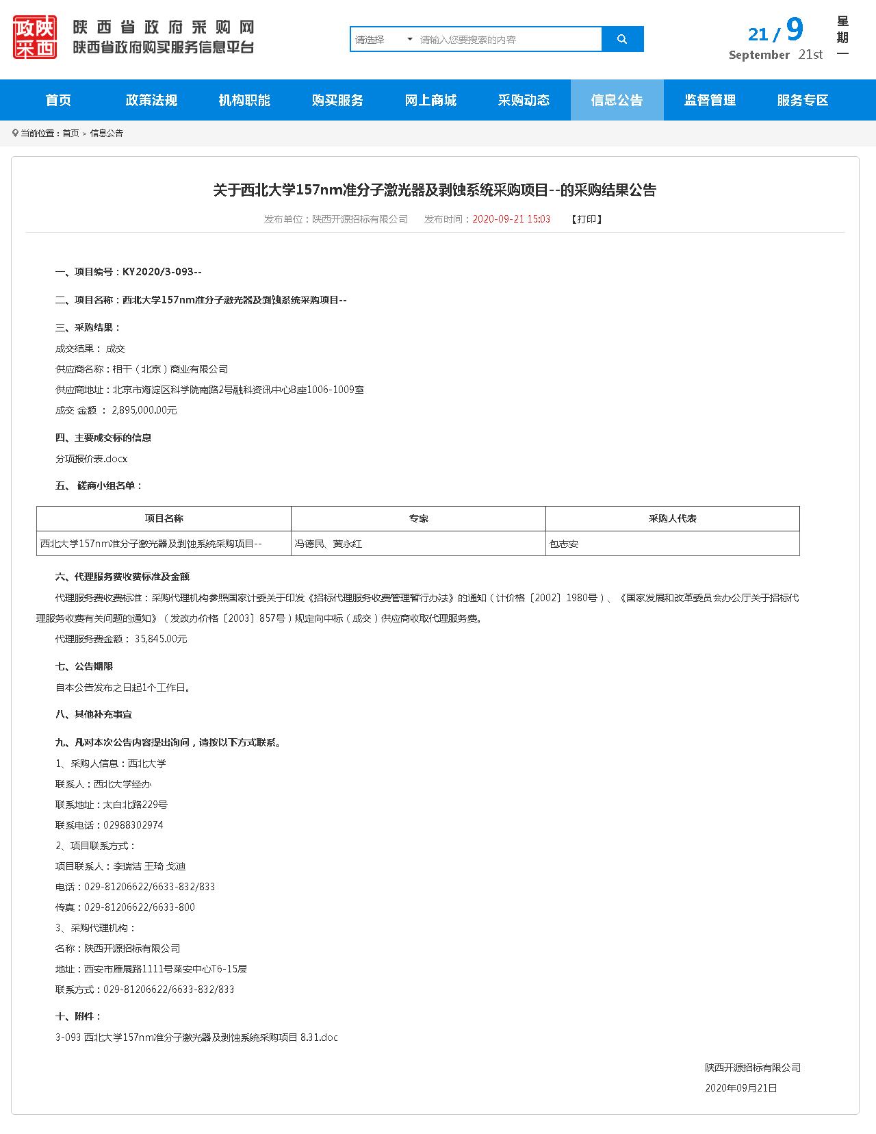 BB平台157nm准分子激光器及剥蚀系统采购项目--的采购结果公告