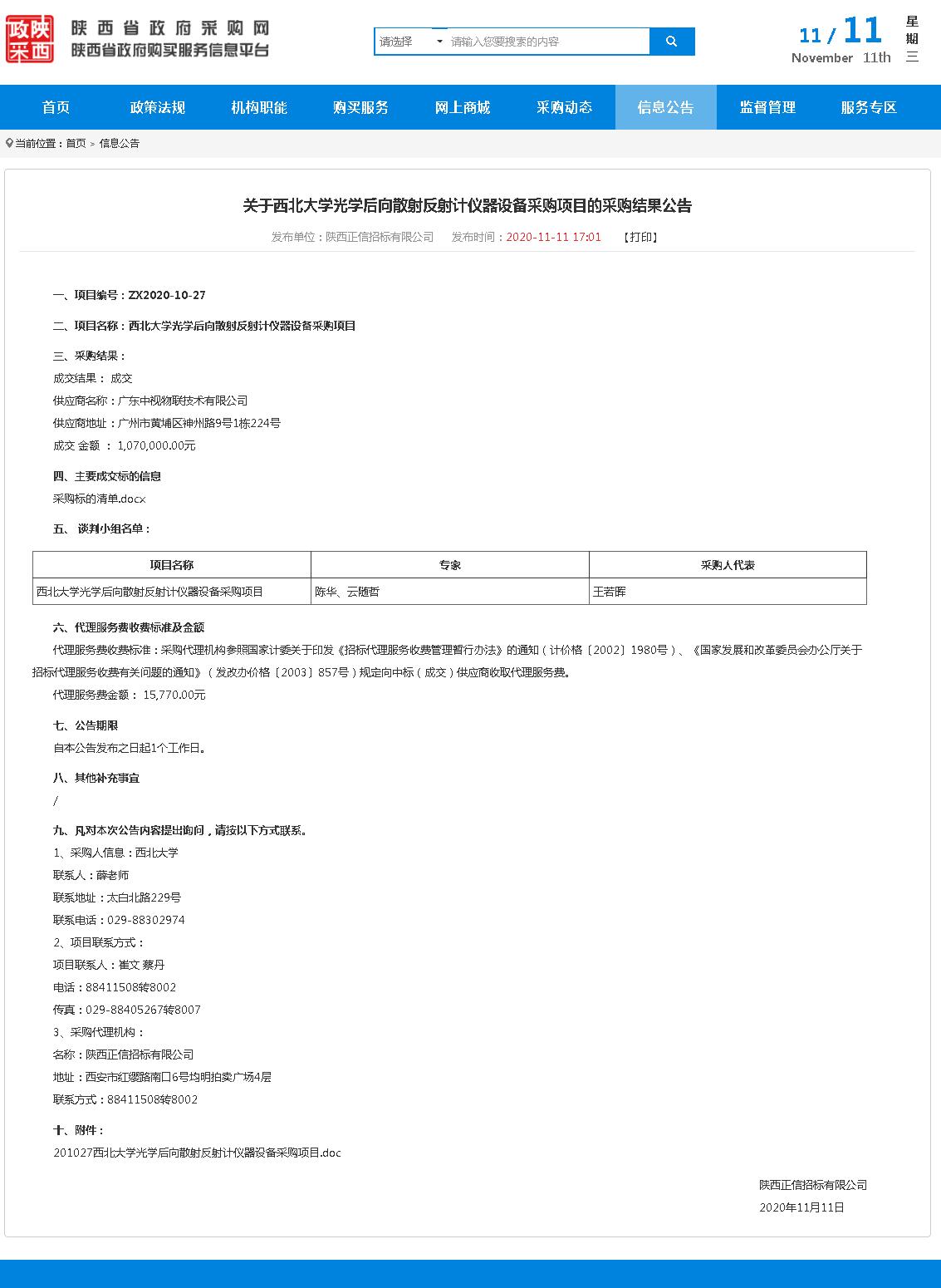 关于BB平台光学后向散射反射计仪器设备采购项目的采购结果公告