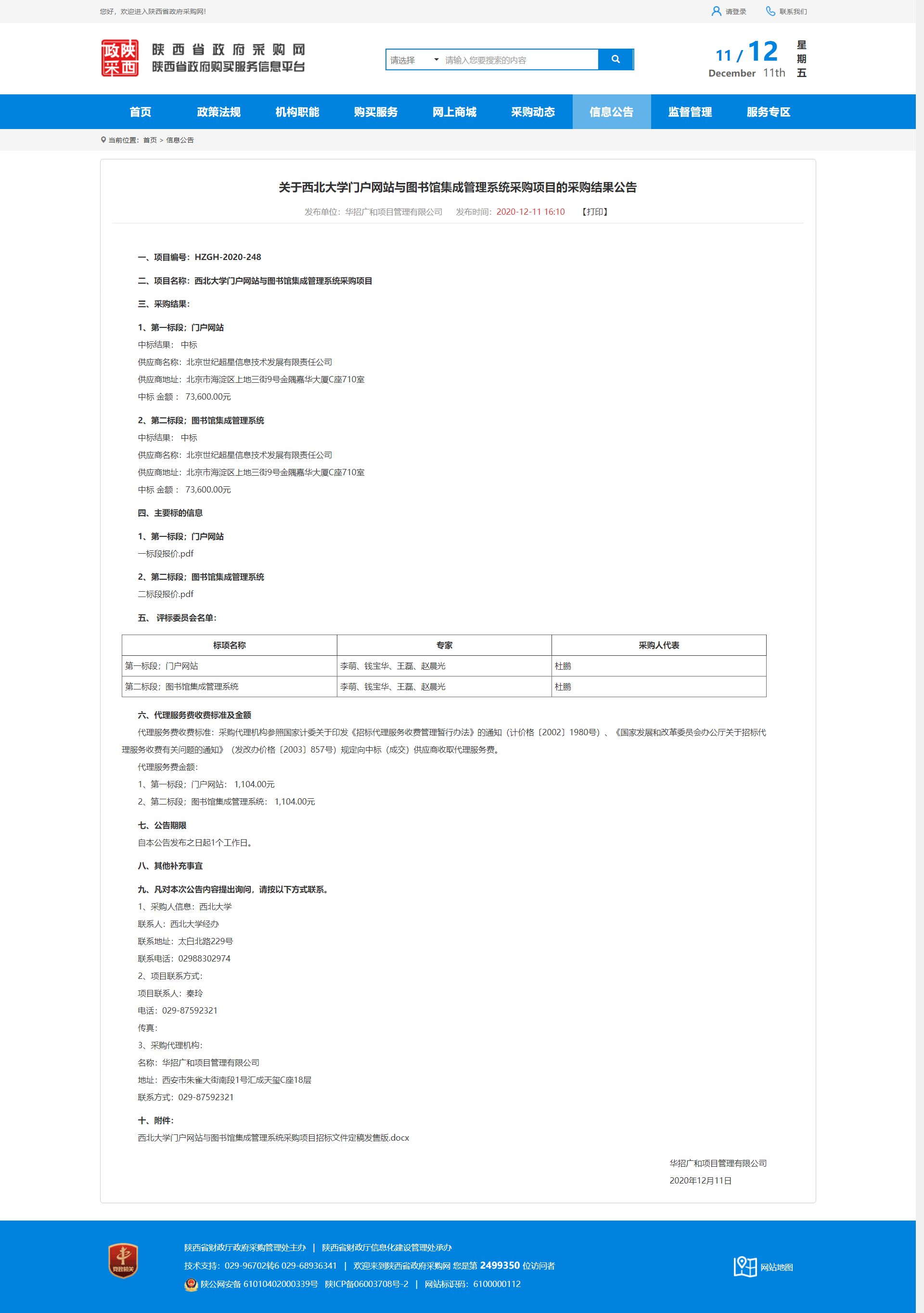关于BB平台门户网站与图书馆集成管理系统采购项目的采购结果公告 作者: 编辑:薛利娟 时间:2020-12-11 原公告地址:http://www.ccgp-shaanxi.gov.cn/notice/noticeDetail.do?noticeguid=8a85be3275d5d5c2017650d7c2df14aa