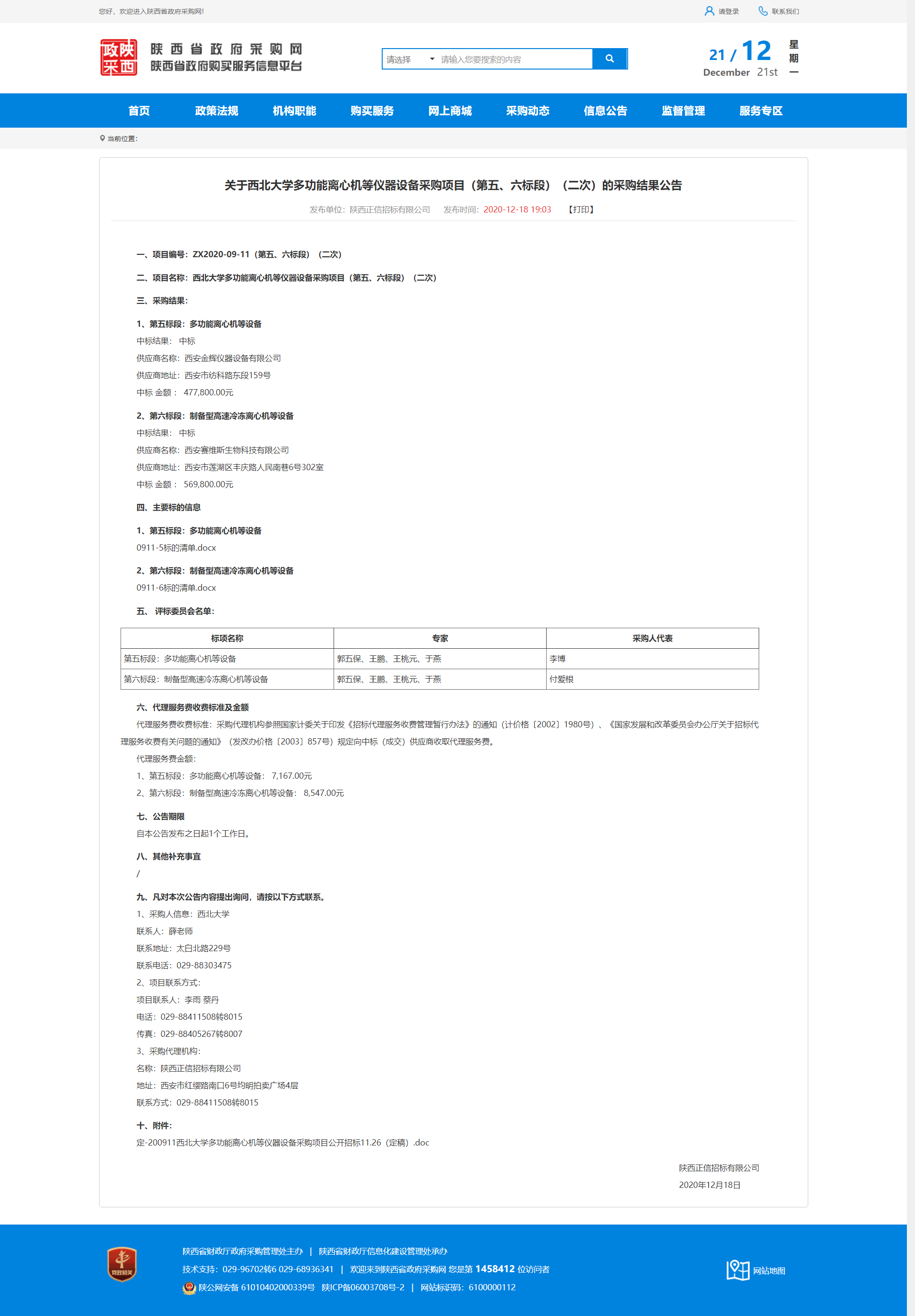 关于BB平台多功能离心机等仪器设备采购项目(第五、六标段)(二次)的采购结果公告 作者: 编辑:薛利娟 时间:2020-12-21 原 原公告地址:http://www.ccgp-shaanxi.gov.cn/notice/noticeDetail.do?noticeguid=8a85be34765f9eac01767583a6a72bec