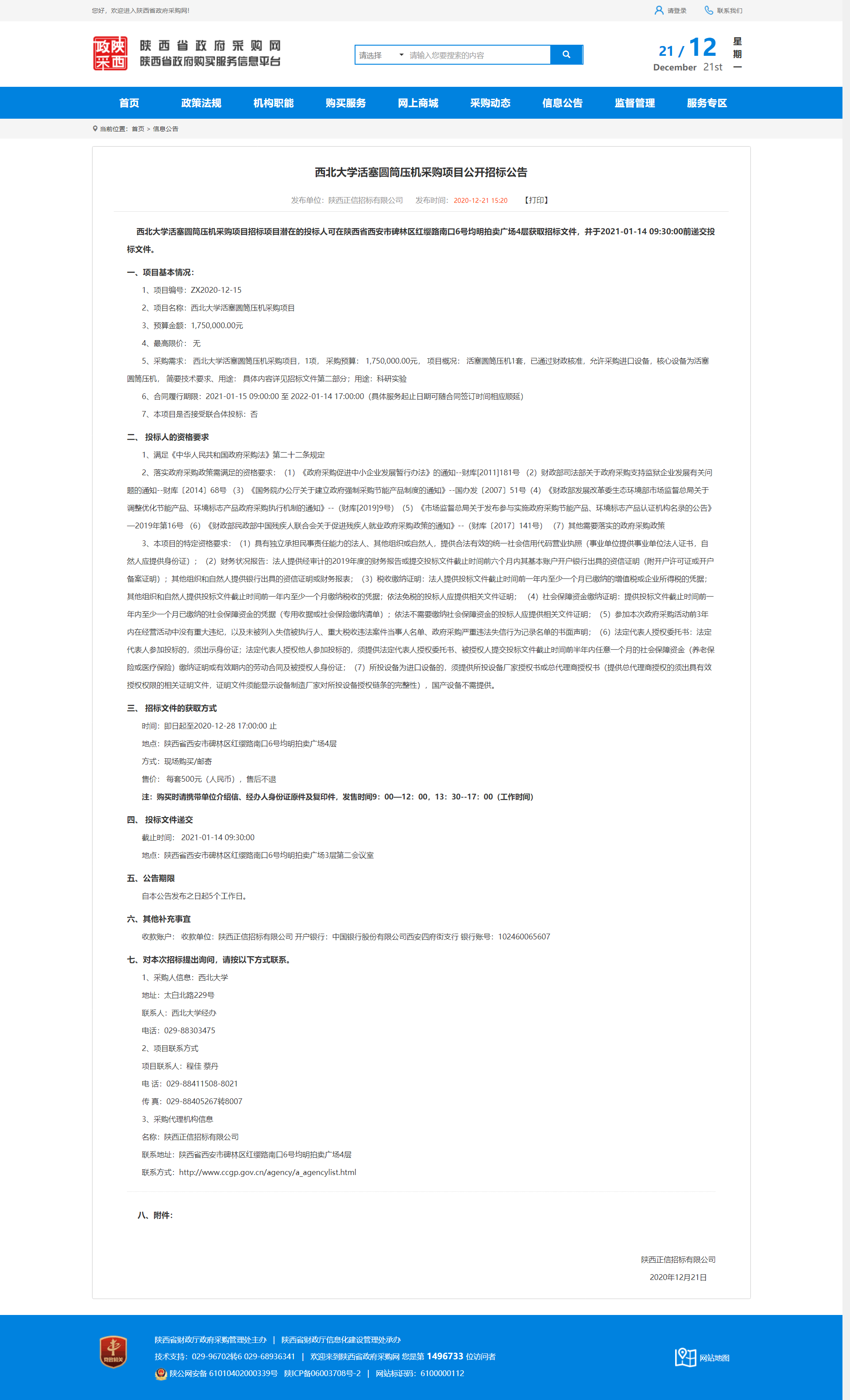 BB平台活塞圆筒压机采购项目公开招标公告 作者: 编辑:薛利娟 时间:2020-12-21 原公告地址:http://www.ccgp-shaanxi.gov.cn/notice/noticeDetail.do?noticeguid=8a85be33765f9dd0017683bb212e48f1