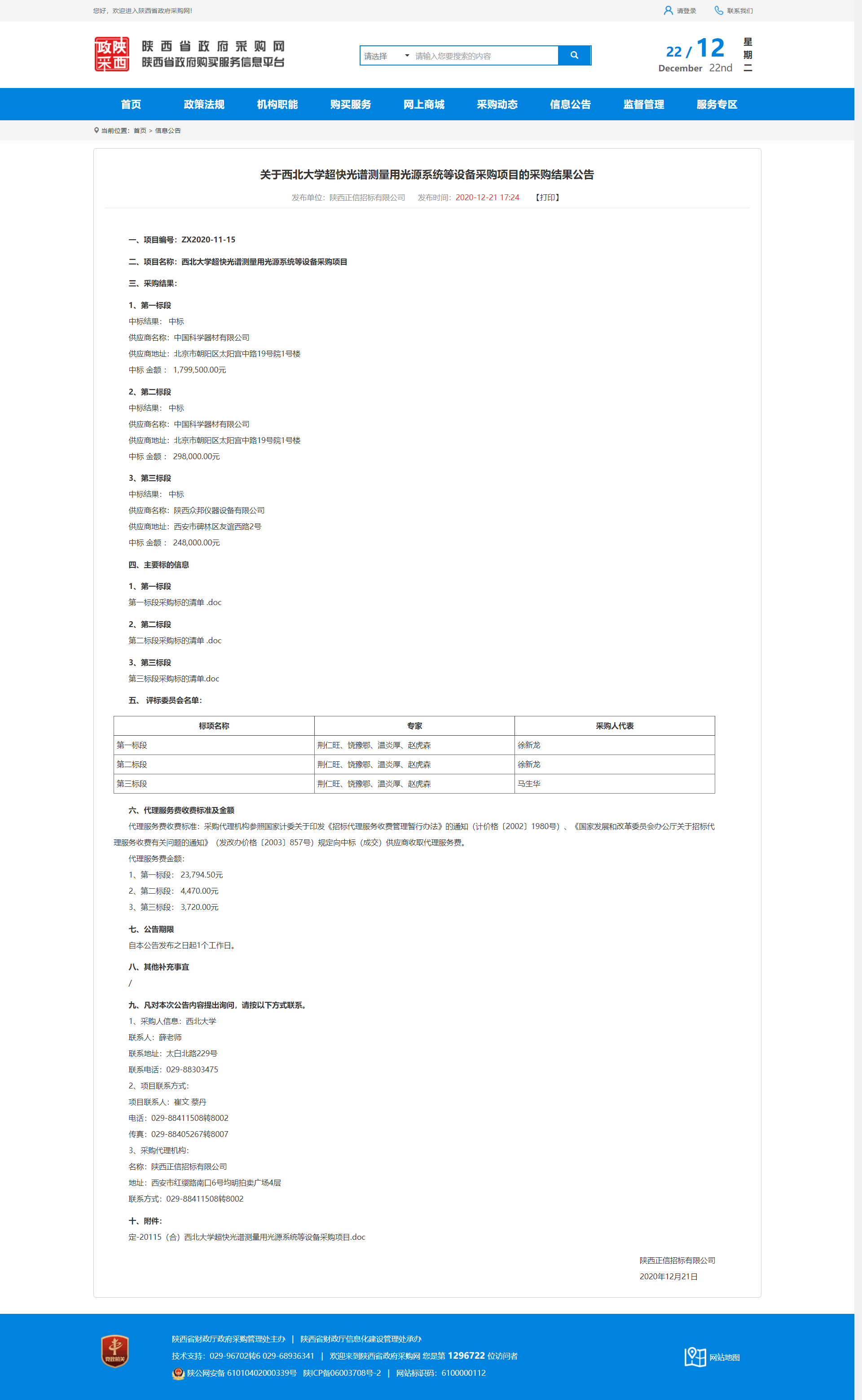关于BB平台超快光谱测量用光源系统等设备采购项目的采购结果公告 作者: 编辑:薛利娟 时间:2020-12-22 原公告地址:http://www.ccgp-shaanxi.gov.cn/notice/noticeDetail.do?noticeguid=8a85be33765f9dd001768497df5d65ae