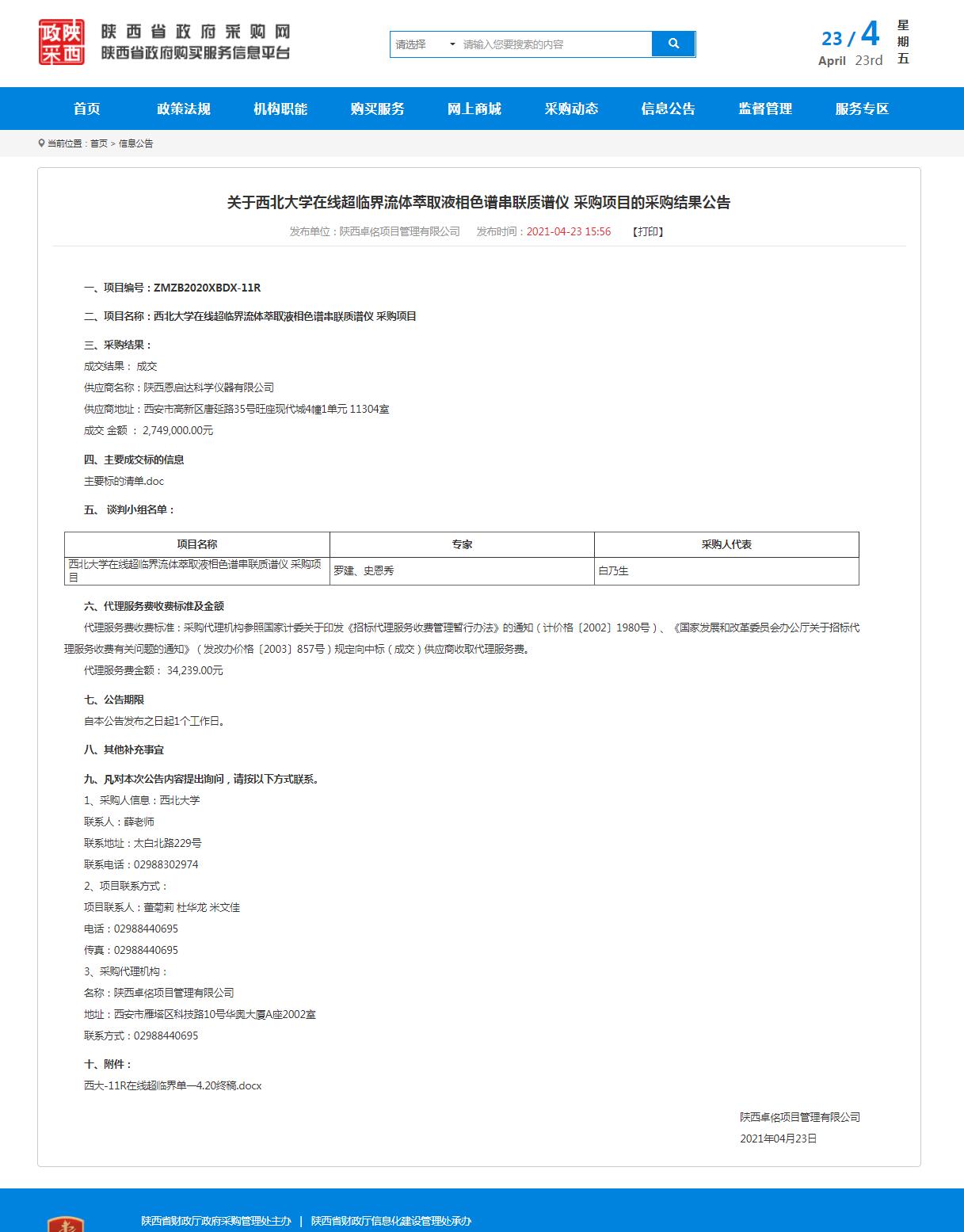 BB平台在线超临界流体萃取液相色谱串联质谱仪 采购项目的采购结果公告