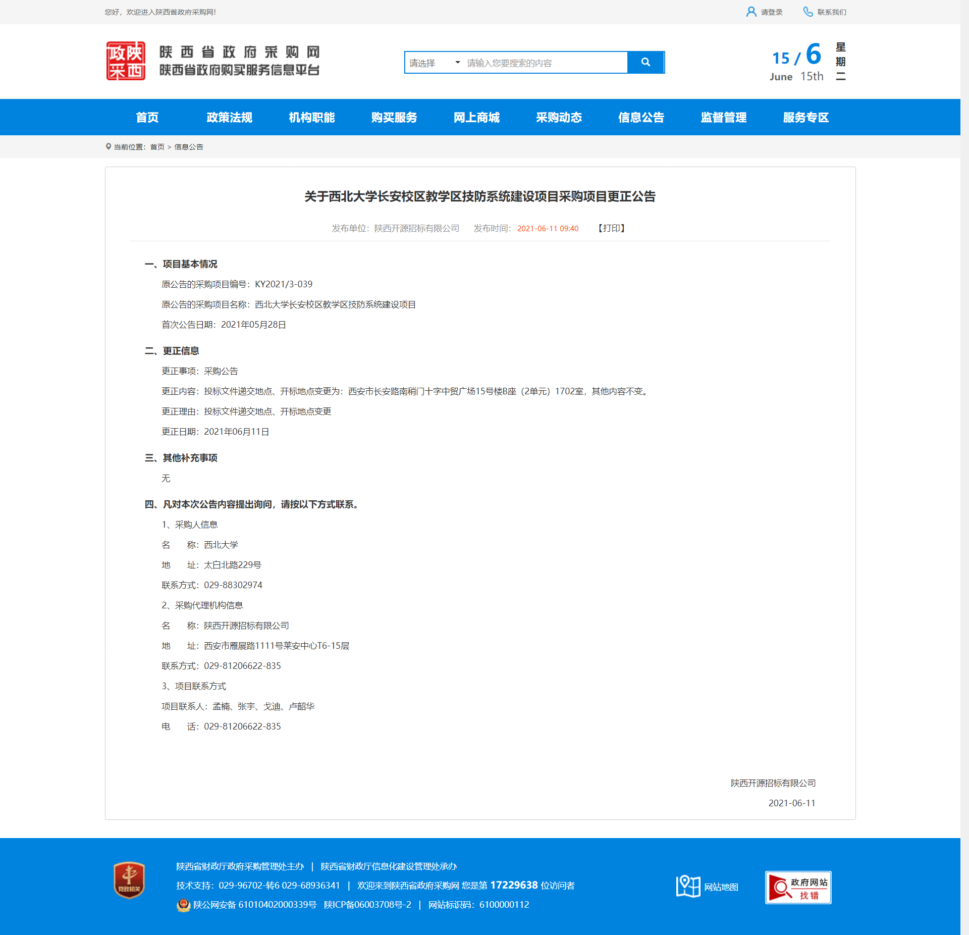 关于BB平台长安校区教学区技防系统建设项目采购项目更正公告 作者: 编辑:薛利娟 时间:2021-06-15 原公告地址:http://www.ccgp-shaanxi.gov.cn/notice/noticeDetail.do?noticeguid=8a85be33791baa0f0179f8ab30151d42