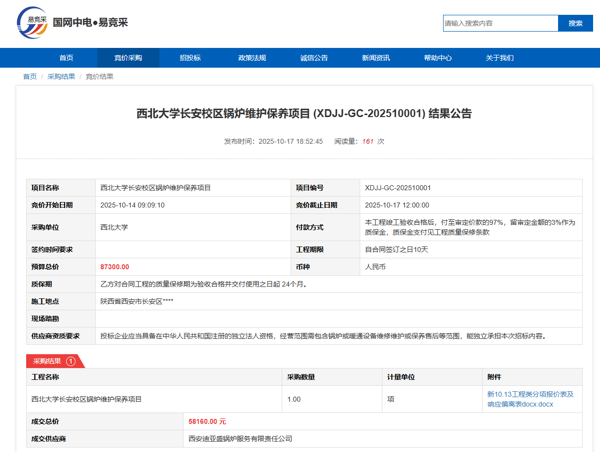 BB平台长安校区锅炉维护保养项目(XDJJ-GC-202510001)竞价结果公告
